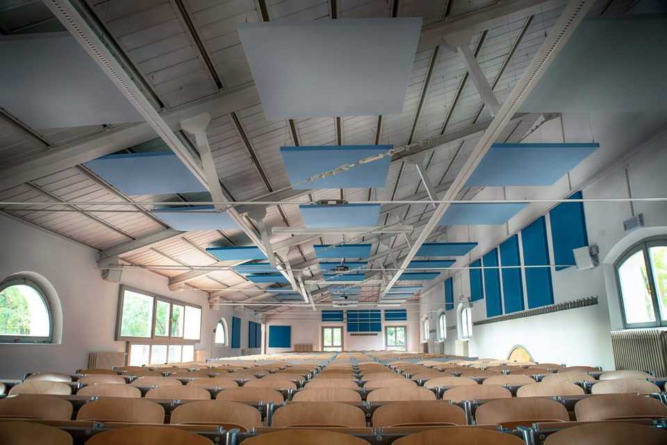 Thus Eterno Ivica, with Silla a leader company in materials and services for building, achieved another success by installing numerous Phonolook panels in the classroom 10 of the University of Ferrara. It is in fact 50 panels of the Phonolook Solution line, both Quadro and Rettangolo with dimensions 1200x1200, 600x1200 and 1200x1800 with metal frame, partly positioned in suspension on the ceiling by a plastic-coated steel kit and partly hung on the walls through a magnet kit. All the panels have a chromatic choice from the most intense blue to light blue.