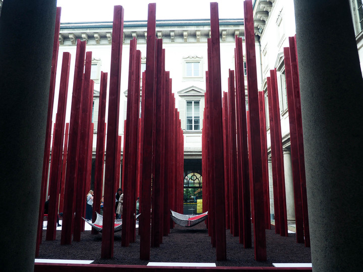 L’installazione di legno, caratterizzata dalla forte proiezione ascendente, interpreta l’elemento naturale del bosco e nel contempo l’architettura di una cattedrale a cielo aperto, continuazione della griglia rinascimentale del Palazzo che, attraverso una matrice di stanze e corridoi interconnessi, conduce ad un luogo di pace e relax. Racconta Asif Khan: "le intime camere circostanti sono intese come un posto dove rilassarsi e conversare durante le intense giornate della Milano Design Week. Una superficie morbida sotto i piedi offre una trama di contrasto con i molti chilometri di marciapiede che i visitatori avranno attraversato"